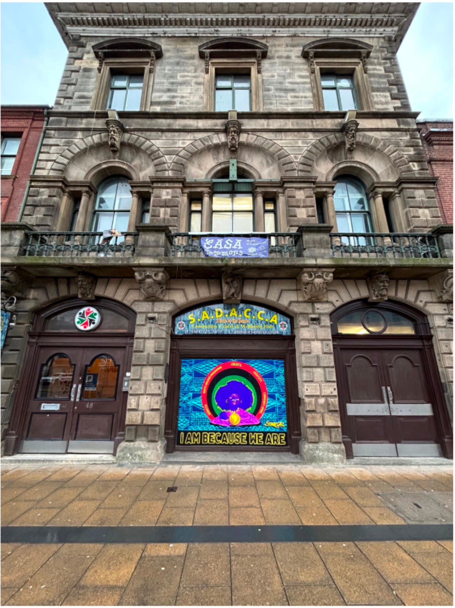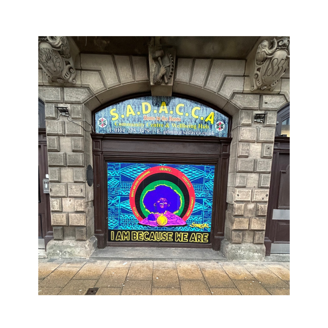 As an artist deeply connected to my heritage and community, I am proud to have been commissioned to create the “Ubuntu” mural for SADACCA, an iconic landmark that embodies resilience, history, and hope for Sheffield’s African and Caribbean community. This mural celebrates SADACCA’s legacy as a sanctuary and cultural hub, reflecting its pivotal role in providing a safe space, in challenging discrimination, and preserving African and Caribbean history through initiatives like the Bantu Archive.