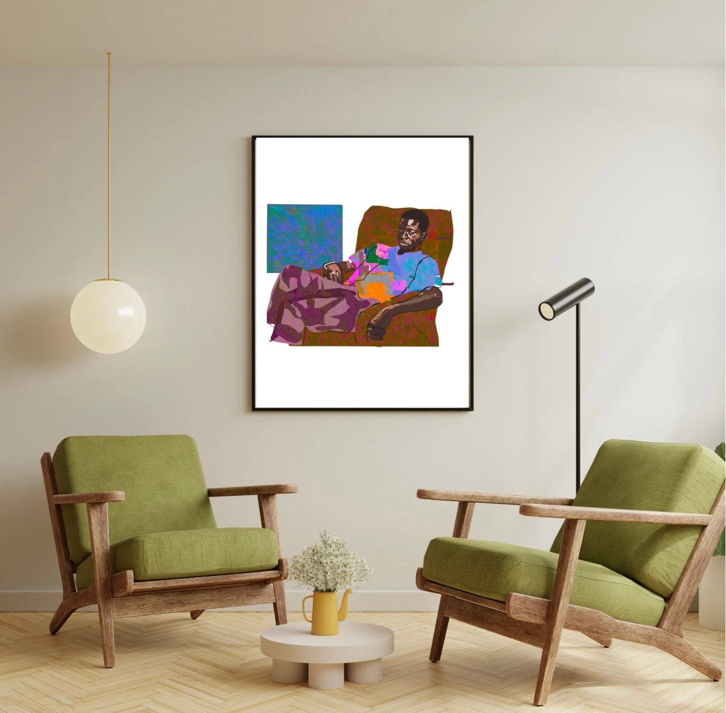 A contemplative indoor scene that explores quiet moments of reflection and our right to rest as a form of resistance. The patchwork blue top incorporates textures from my nature photography, while the warm background features subtle patterns derived from bark and natural fibres. This piece demonstrates my process of transforming nature photography, finding the organic elements in our everyday environments and weaving them into a patchwork of vibrant digital interpretation.