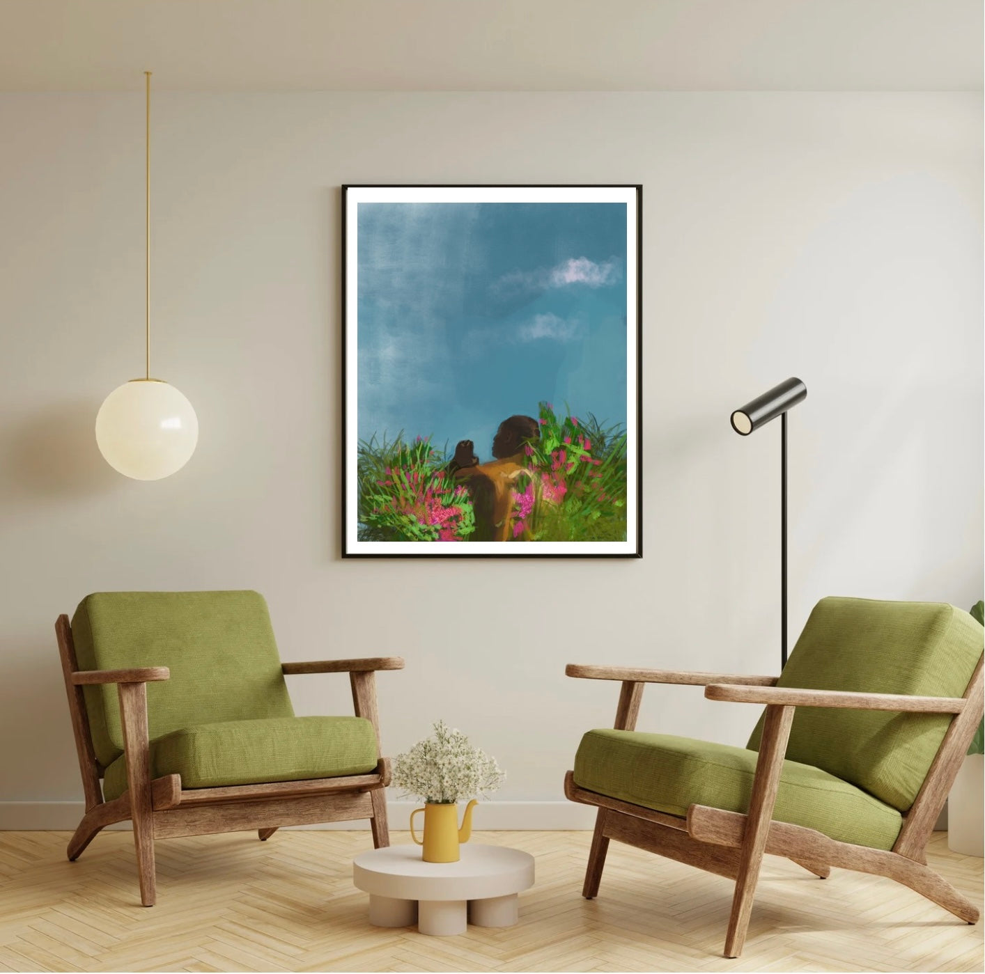 The unclothed figure gazes skyward amid hazy wildflowers, embodying our fundamental connection to and awe of the natural world. The composition invites viewers to experience that moment of transcendence when we surrender to nature's beauty and find ourselves truly present.