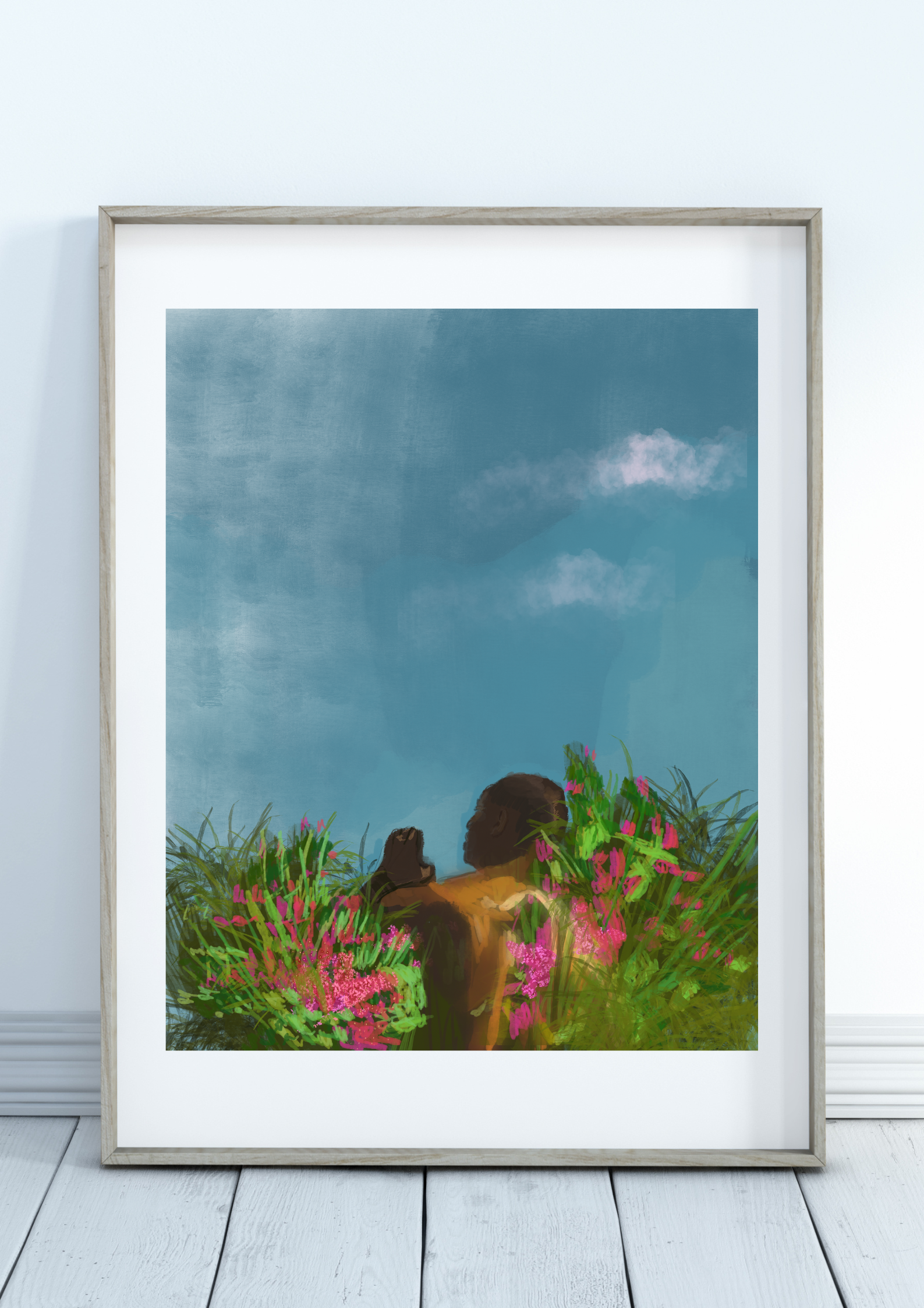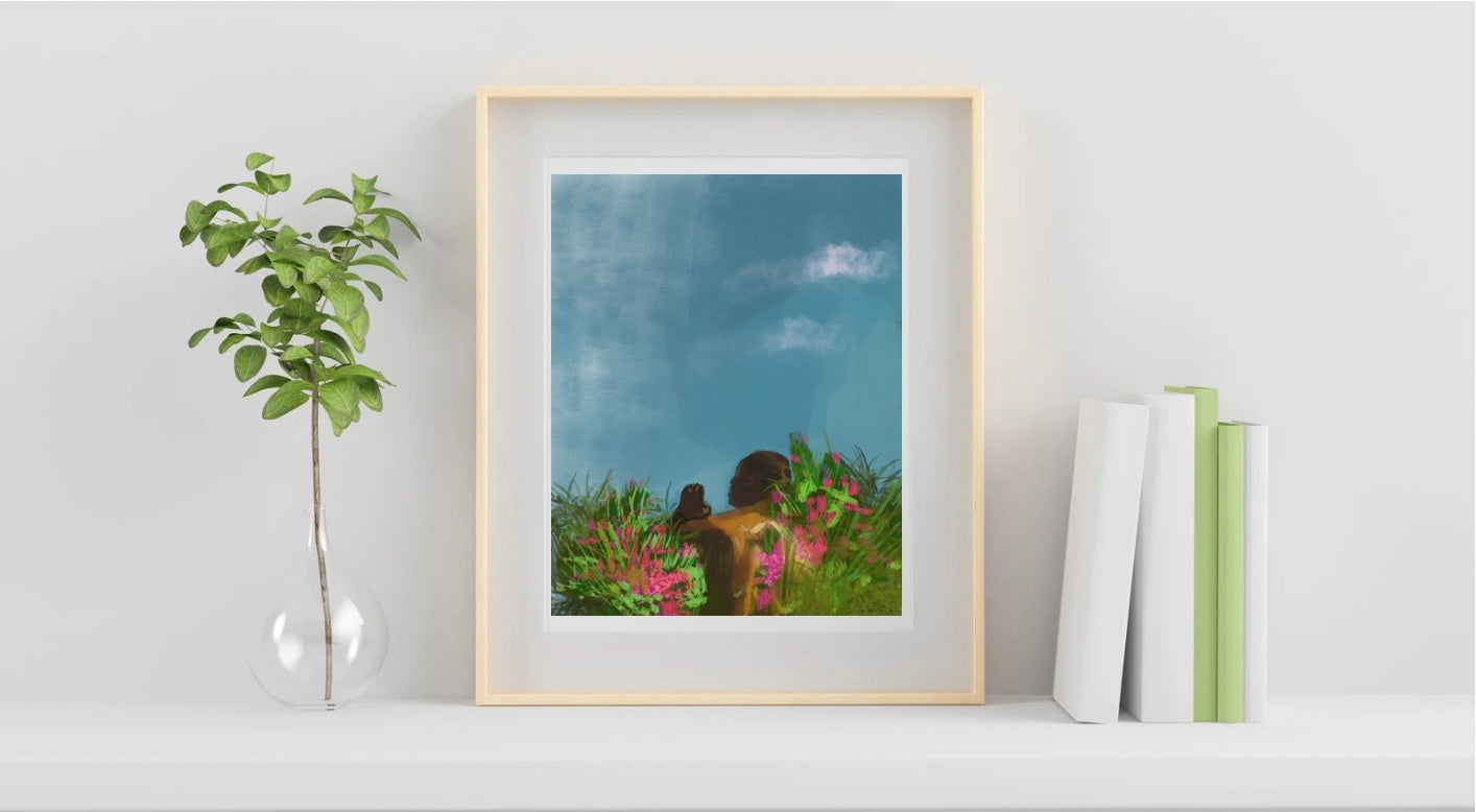 This tranquil composition captures a moment of peaceful communion with nature and explores the profound effect of a blue sky on our feelings of wellbeing. For me, the significance of blue sky is connected to many happy summers spent outdoors. Inspired by my nature walks in the Peak District, this digital illustration represents the serene beauty I've encountered in those landscapes.